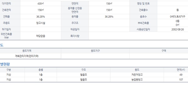 대지10430㎡(3155평) / 건물1362㎡(412평)